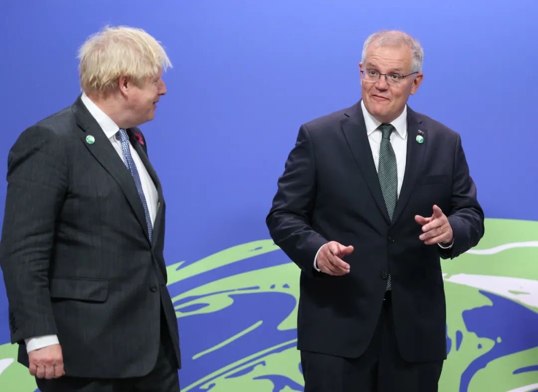 当地时间2021年11月1日,英国格拉斯哥,澳大利亚总理莫里森(右)出席《联合国气候变化框架公约》第二十六次缔约方大会世界领导人峰会。图/IC photo
