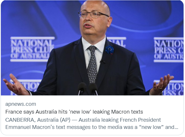 这条领导人之间的私人短信被曝光让法国“大为光火”,法国驻澳大利亚大使特博称,短信的泄露无益于修复两国关系的信心,“在信任和真相方面,这是(两国关系间)前所未有的新低”。