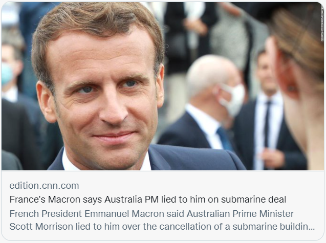 据《卫报》报道,澳大利亚媒体《每日电讯报》曝光了马克龙的短信内容。在“AUKUS”被宣布的两天前,马克龙曾发消息给莫里森,上面写道,“我应该为我们的潜艇合同期待好消息还是坏消息?”