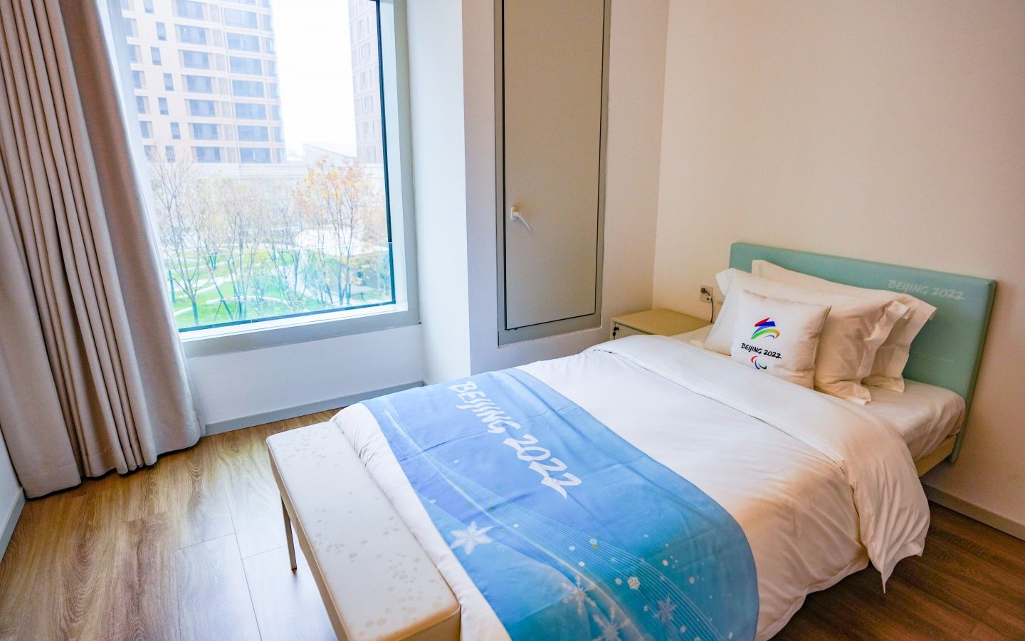 李彬介绍,考虑残障运动员的需求,所有房间均设立了完备的残疾人设施:室内门采用带有把手的平移门;无障碍卫生间地面为防滑地面,设置两侧有安全抓杆的坐便器,洗手盆为高度800mm的台式洗手盆;无障碍淋浴间设置了安全抓杆和淋浴凳等。在北京冬奥会、冬残奥会转换期间,每张床的床脚将进行拆卸,床的高度降低30厘米。