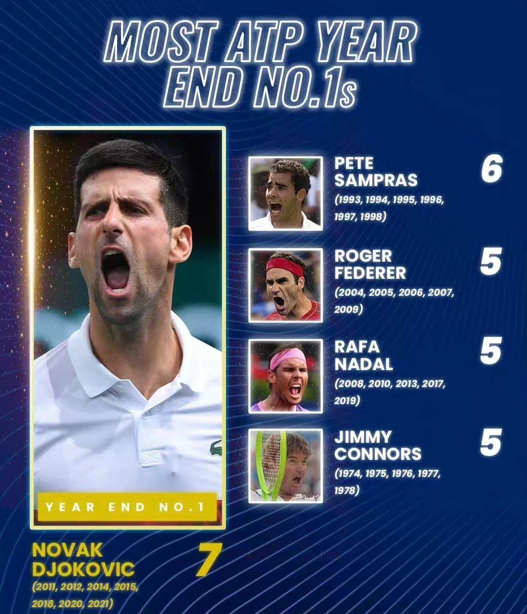 在年终第一排行榜上,德约科维奇已独占榜首,紧随其后的是桑普拉斯(6次),费德勒、纳达尔和康纳斯各5次。2004年至今的18个赛季,德约科维奇、费德勒和纳达尔三巨头共垄断了17次年终第一。唯一的例外是2016年,穆雷凭借赛季末的疯狂表现最后时刻从德约科维奇手中抢走年终第一。