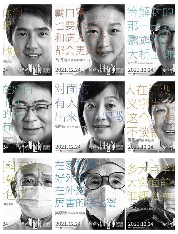 新京报讯(记者 滕朝)11月8日,由薛晓路执导的年度温暖大片《穿过寒冬拥抱你》发出人物海报,首度曝光周冬雨、刘昊然出演,与黄渤、贾玲、朱一龙、徐帆、高亚麟、吴彦姝、许绍雄等一众实力演员共同温暖贺岁。海报以生活化的文案再现疫情之下普通人的情感与愿望,尽显武汉这座城市的人间百态。众角色笑容温暖,即使面戴口罩也掩藏不住一张张有故事的脸庞,搭配契合职业身份的心声台词,画面感染力十足。