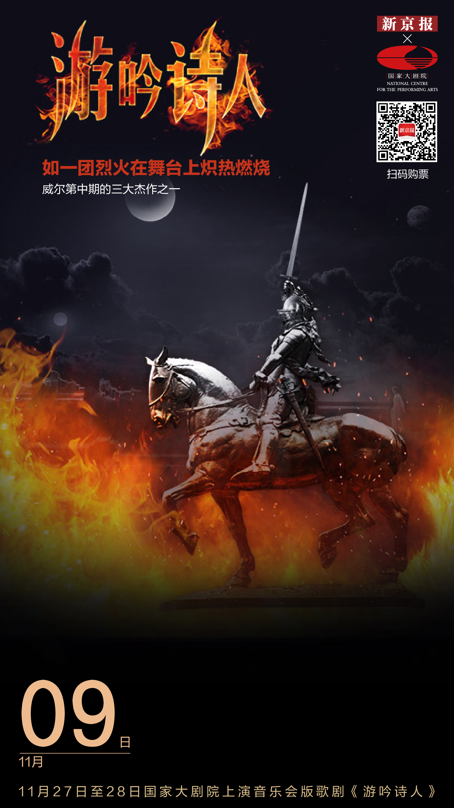 百余年来,歌剧《游吟诗人》作为威尔第中期的三大杰作之一,犹如一团烈火在舞台上炽烈燃烧。2021年时值歌剧巨匠朱塞佩·威尔第逝世120周年,国家大剧院继4月成功上演歌剧《茶花女》后,在11月策划推出《“乘着金色的翅膀”纪念威尔第音乐会》和音乐会版歌剧《游吟诗人》的联袂演出,既向伟大作曲家致敬,也让观众全面领略威尔第歌剧丰厚的音乐内涵,其中,音乐会版歌剧《游吟诗人》 将于11月27日至28日登台。
