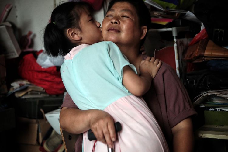 7月18日,河南南阳,贾云家中,贾云收养的第三个孩子——小女儿刘金玉亲吻她的脸颊。《收养三个弃婴的好心妈妈》
