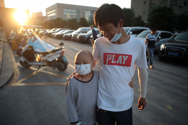 9月4日,河南省肿瘤医院附近,杨文广父子俩相拥闲聊。《和时间赛跑的骑手父亲》