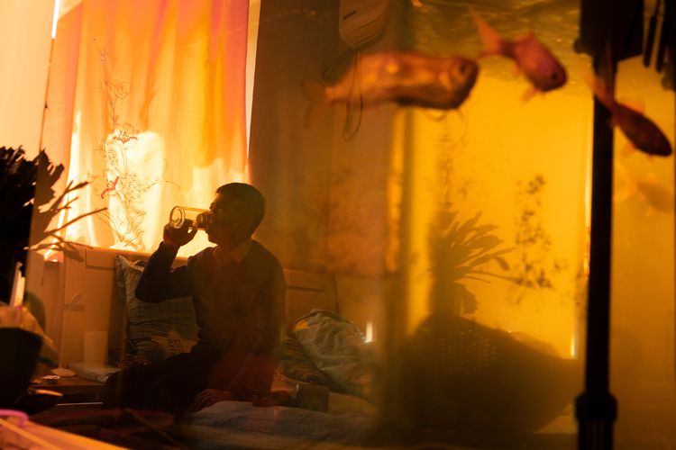 胡茂东坐在床上吃止疼药。妻子为了给他缓解压力,在卧室里养了一缸金鱼。《火场英雄胡茂东:等一个“重生”的机会》