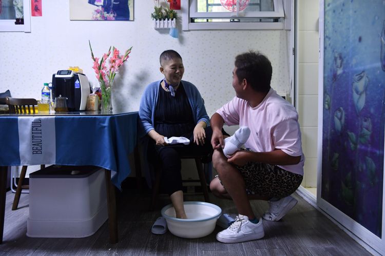 张海燕的儿子刚下班回家,听说当天母亲跑了两家医院很疲惫,马上给她倒上了泡脚水。《报社接线员:为了难以割舍的亲情,我想活!》