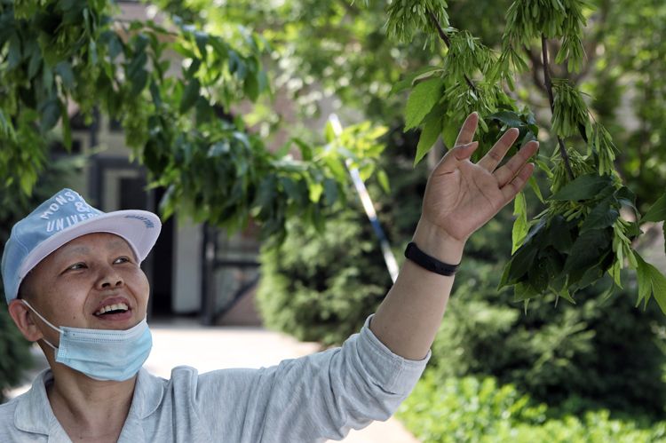 6月9日,殷巧亮在公园散步,“真好看啊”,她对着绿色树叶发出赞叹,并伸手去抚摸,摘下口罩感受自然的气息。《与乳腺癌抗争11年的“辽宁好人”》
