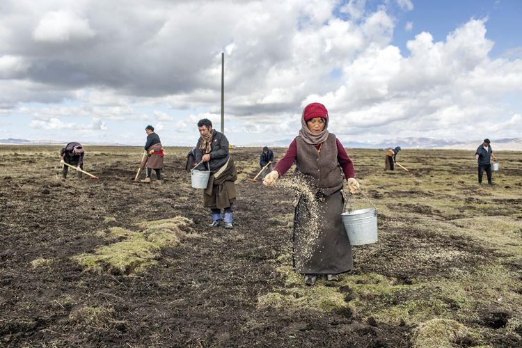 2021年4月24日,四川省阿坝州若尔盖县麦溪乡噶沙村草场,牧民们正在为黑土滩播撒草种。《播种者》