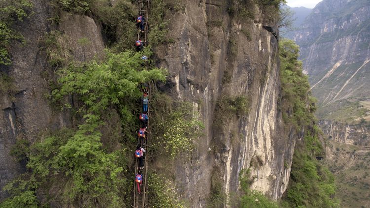 2016年5月24日,在3名家长的保护下,15个孩子从山下的勒尔小学出发,踏上放学回家的路。他们要顺着垂直的悬崖攀爬17条藤梯,才能抵达比山下学校垂直高度超过800多米的“悬崖村”,即阿土列尔村。《 “光速进化”的悬崖村》