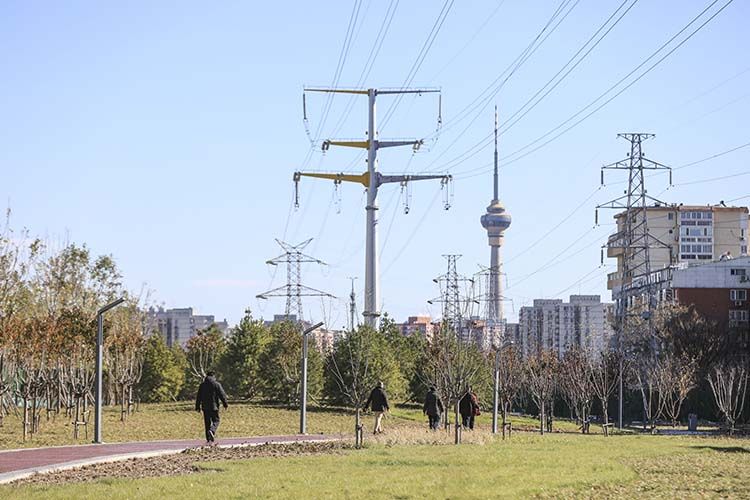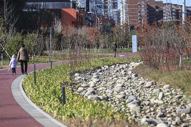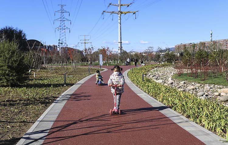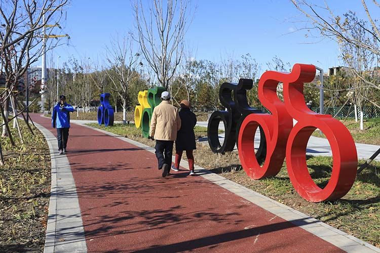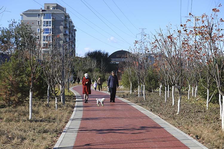 日前,冬奥沿线阜石路景观廊道永定路街道路段亮相。阜石路景观廊道是冬奥会重要联络线的环境保障项目。项目总面积约17公顷,目前,工程已完成进度的80%,计划于今年年底前全面完工。另外,位于永定路西、阜石路南的永建公园也将于下周正式开园。图为:11月9日,市民在已建好亮相的阜石路景观廊道内遛弯儿。
