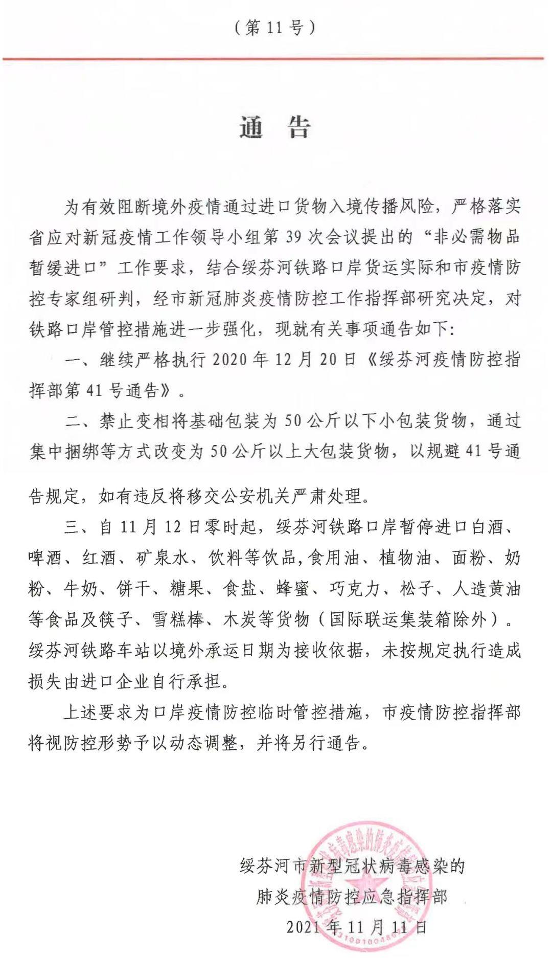 据央视新闻客户端消息,11月11日,黑龙江绥芬河疫情防控指挥部发布通告,自11月12日零时起,绥芬河铁路口岸暂停进口白酒、啤酒、红酒、矿泉水、饮料等饮品,食用油、植物油、面粉、奶粉、牛奶、饼干、糖果、食盐、蜂蜜、巧克力、松子、人造黄油等食品及筷子、雪糕棒、木炭等货物(国际联运集装箱除外)。