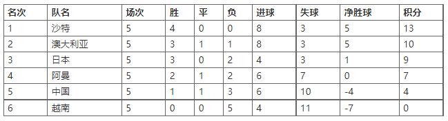本轮战罢,越南队5战皆负继续垫底,沙特队与澳大利亚队分别以13分和10分排名小组积分榜前两位,日本队缩小了与小组第2名澳大利亚队的积分差距,位居小组第3名。
