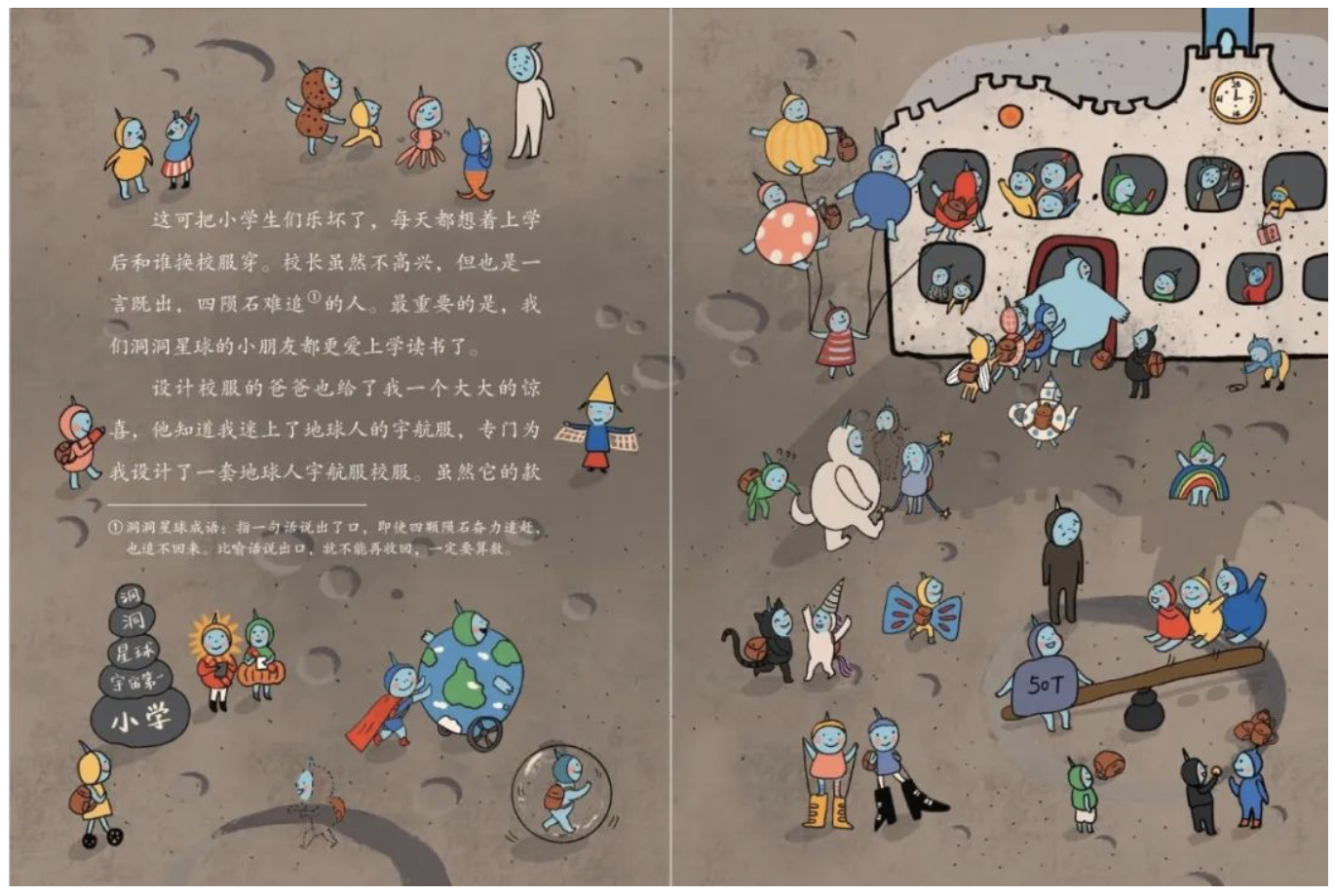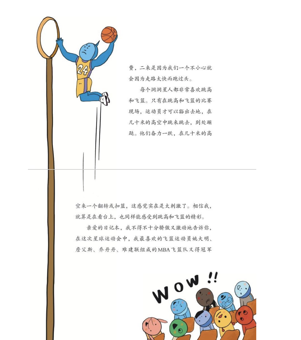 比如我们都知道月球的引力很小,只有地球的六分之一,基于这一科学知识点,我干脆让洞洞星球(地球人口中的月球)举办了轰动太阳系的第3598届星球运动会,重点描述了飞篮这一兼具地球和太空风格的运动,也让小读者有一种别样的太空体验。