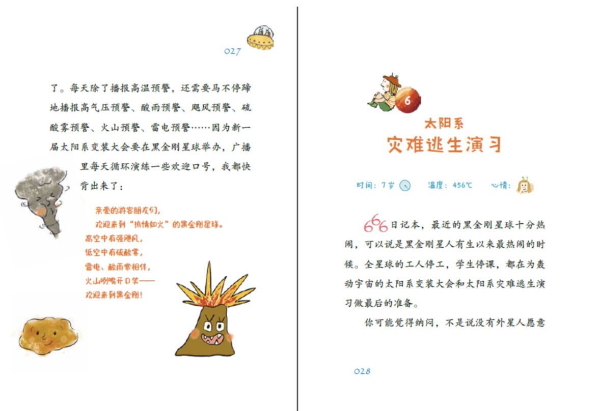再比如金星的环境极其恶劣,高温高压、雷电和酸雨常相伴,所以我在《逃离黑金刚星球》中创造了“太阳系灾难逃生演习”,宇宙消防员、宇宙保安、宇宙警察等外星人身穿特级防护服,脸戴防毒面罩,来到灾难的天堂黑金刚星球逃生演习,只为保卫各大星球安全……