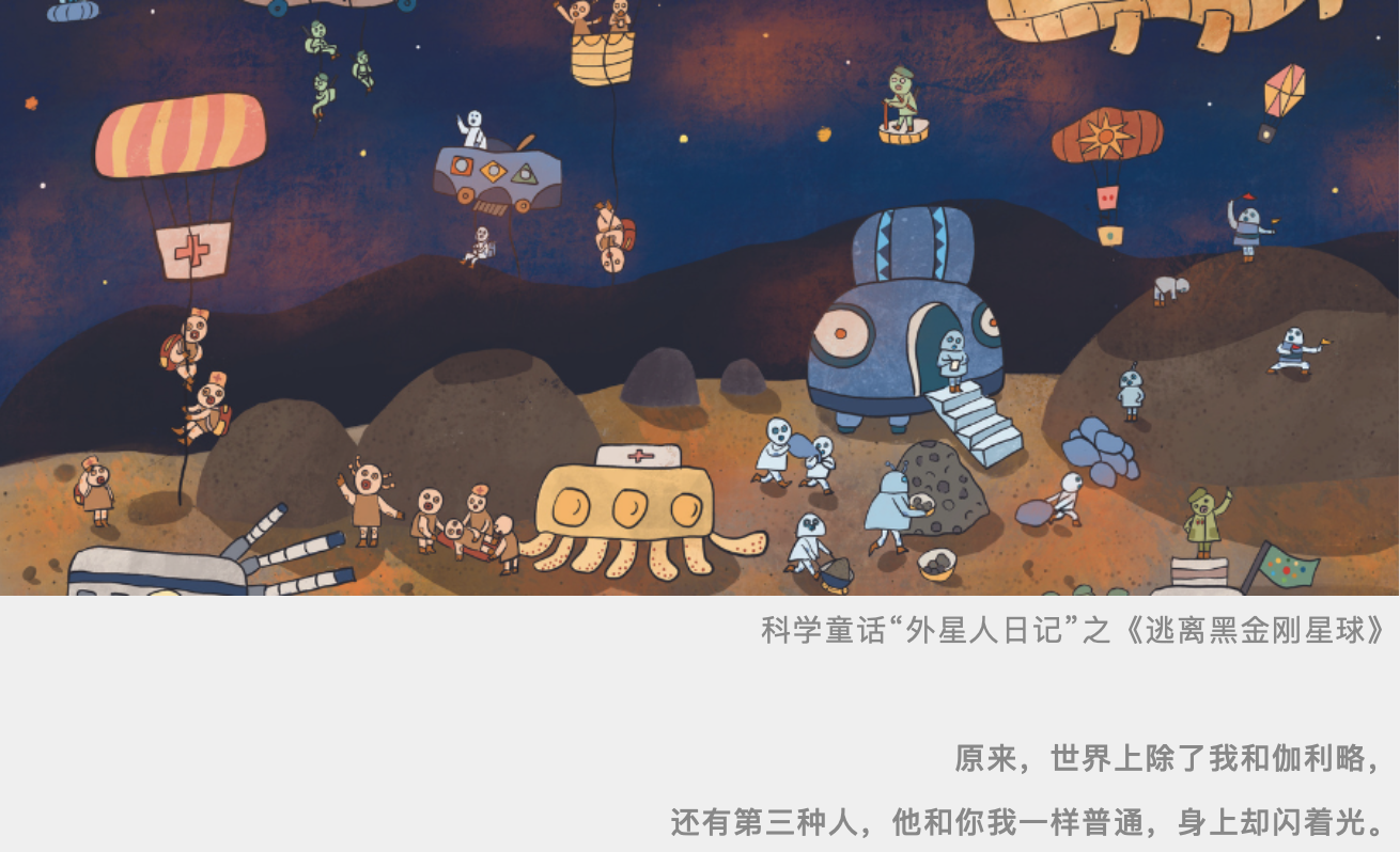但嘻嘻哈哈打着科学外衣的外星人故事也不是我心心念念的。科学之于专业人士是知识与学习,于我却是感受和体验。我从中感受到别样的浪漫与惊奇,更有一往无前的壮阔和对生命的敬畏,我希望把这种化石一般存在心里的感受和小朋友一同分享。也许,只有我自己才能写出基于科学想象的“幽灵、地精和外星人”。