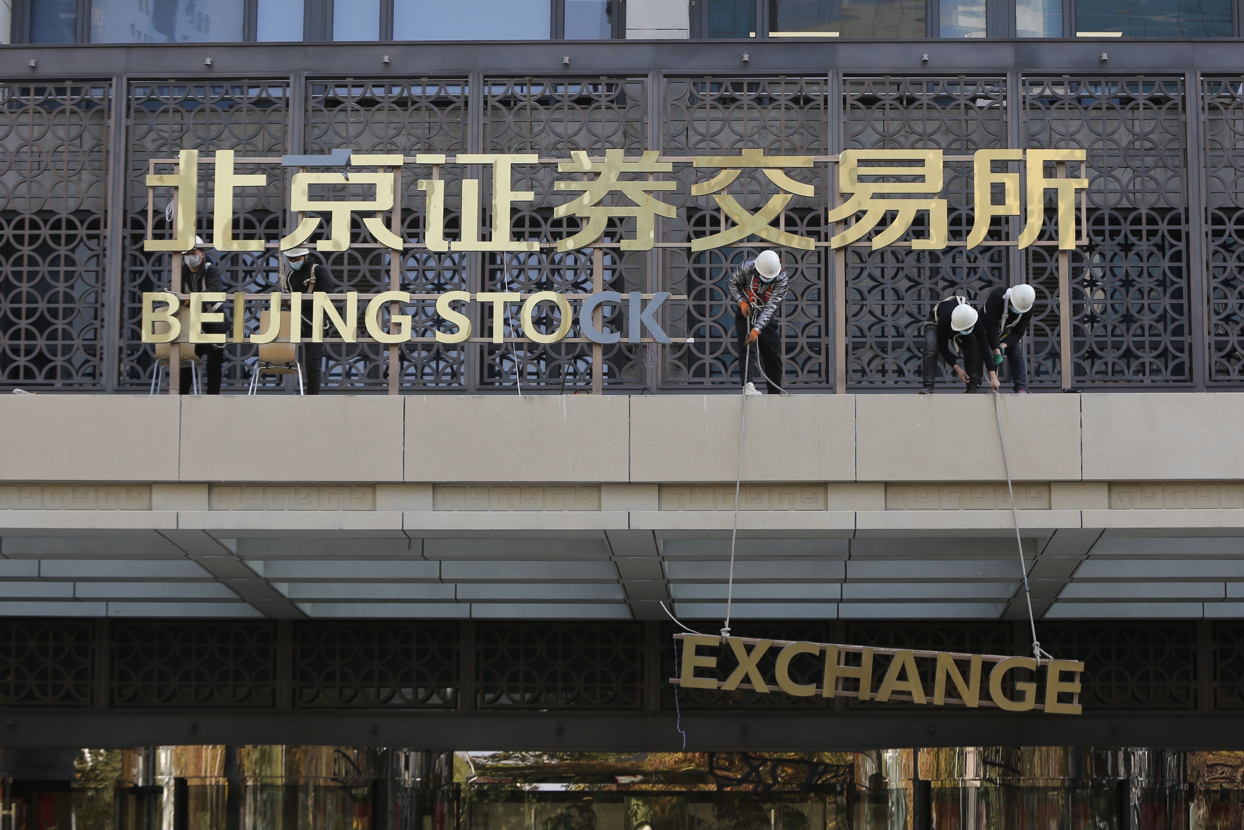 ▲11月14日,在北京市金融街,北京证券交易所办公大楼正在进行门牌吊装和焊接的工作。11月15日,北交所所有股票将在这里正式开市交易。新京报记者 郑新洽 摄