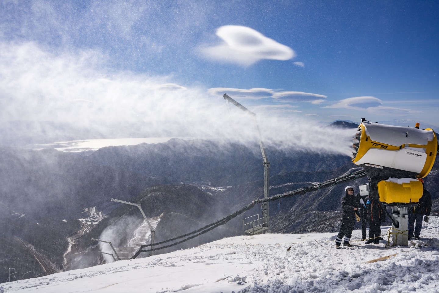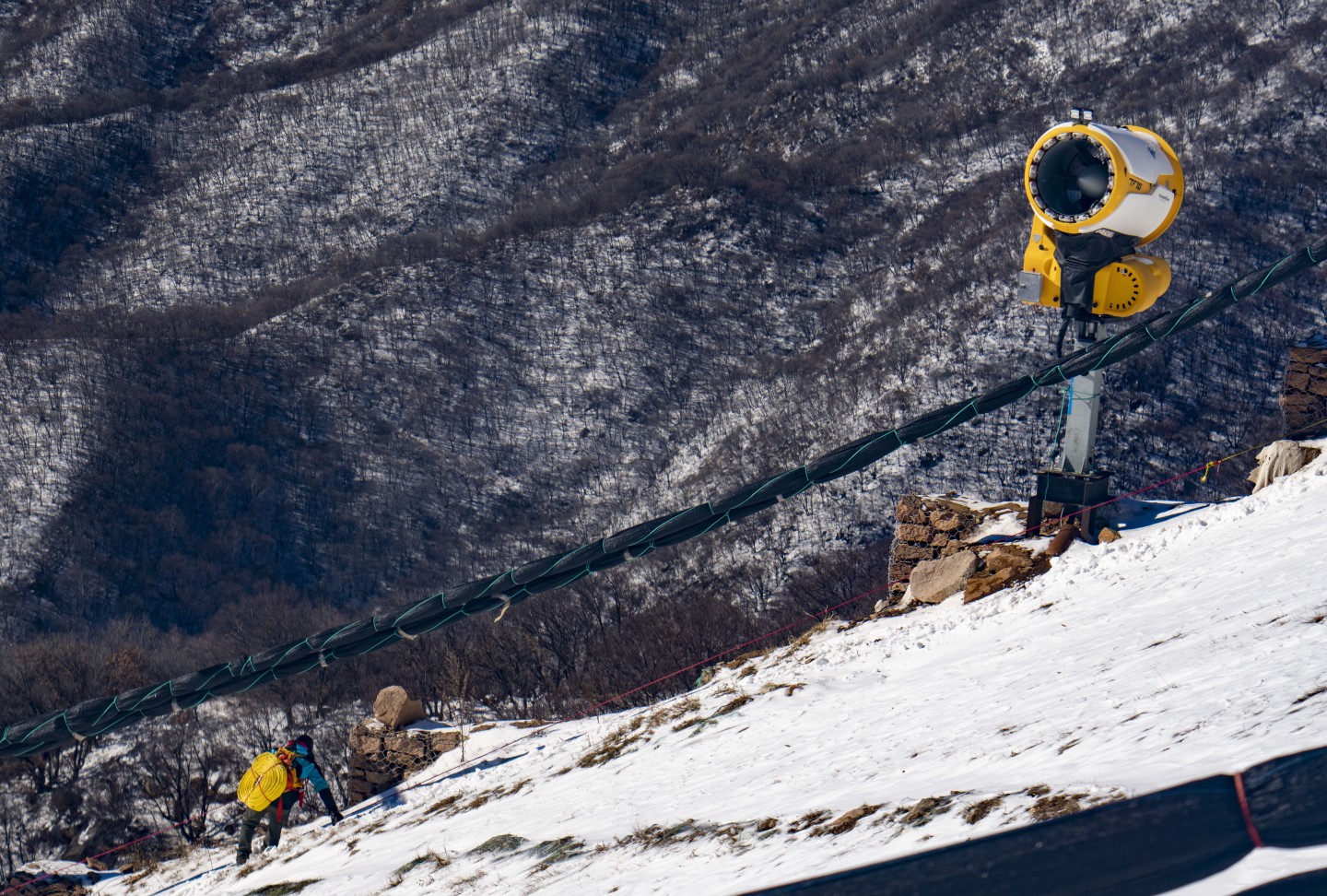 造雪开始前,工作人员通过绳索到达各个造雪机的位置对设备进行调试。新京报记者 陶冉 摄