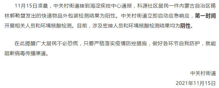 新京报快讯 据乐活中关村官微消息,11月15日凌晨,中关村街道接到海淀疾控中心通报,科源社区居民一件内蒙古自治区锡林郭勒盟发出的快递物品外包装检测结果为阳性。中关村街道立即启动应急响应,第一时间开展相关人员和环境核酸检测。目前,涉及密接人员和环境核酸检测结果均为阴性。