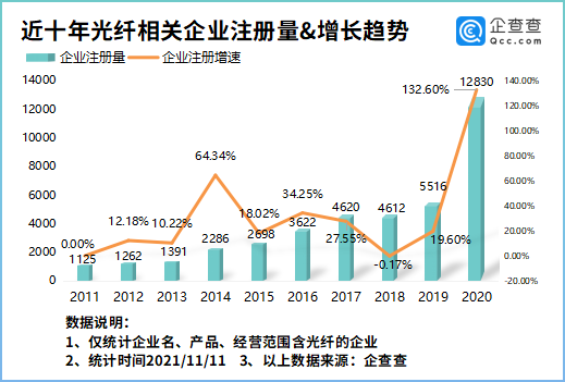 企查查数据显示,我国现存光纤相关企业6.57万家。2019年我国新增光纤相关企业5516家,同比增长19.60%。2020年新增1.28万家光线相关企业,同比增长132.60%,是近十年新增最多的一年,也是增速最快的一年。