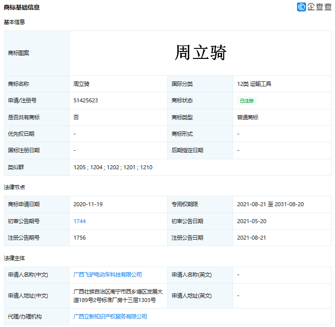 新京报贝壳财经讯 企查查APP显示,近期,广西飞驴电动车科技有限公司成功注册周立骑商标,商标国际分类涉运输工具、科学仪器,该公司成立于2020年1月,此前,该电动车公司曾发声明确认周立齐签约成为联合创始人。