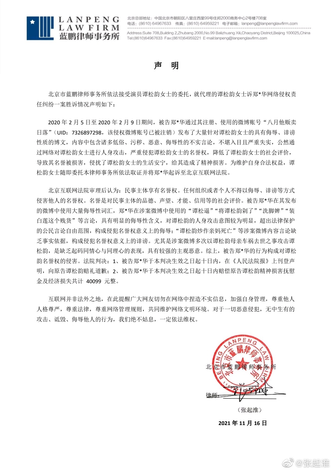 声明中表示,2020年2月5日至2020年2月9日期间,被告郑某华通过其注册、使用的微博账号发布大量针对谭松韵的具有侮辱、诽谤性质的博文,内容中包含诸多低俗、污秽、恶意、侮辱性的不实言论,严重侵犯谭松韵的名誉权。北京互联网法院审理后,判处被告郑某华的行为构成对谭松韵名誉权的侵害。被告于判决生效之日起十日内,在《人民法院报》上刊登声明,向原告谭松韵赔礼道歉,并赔偿原告精神损害抚慰金及经济损失共计40099元整。