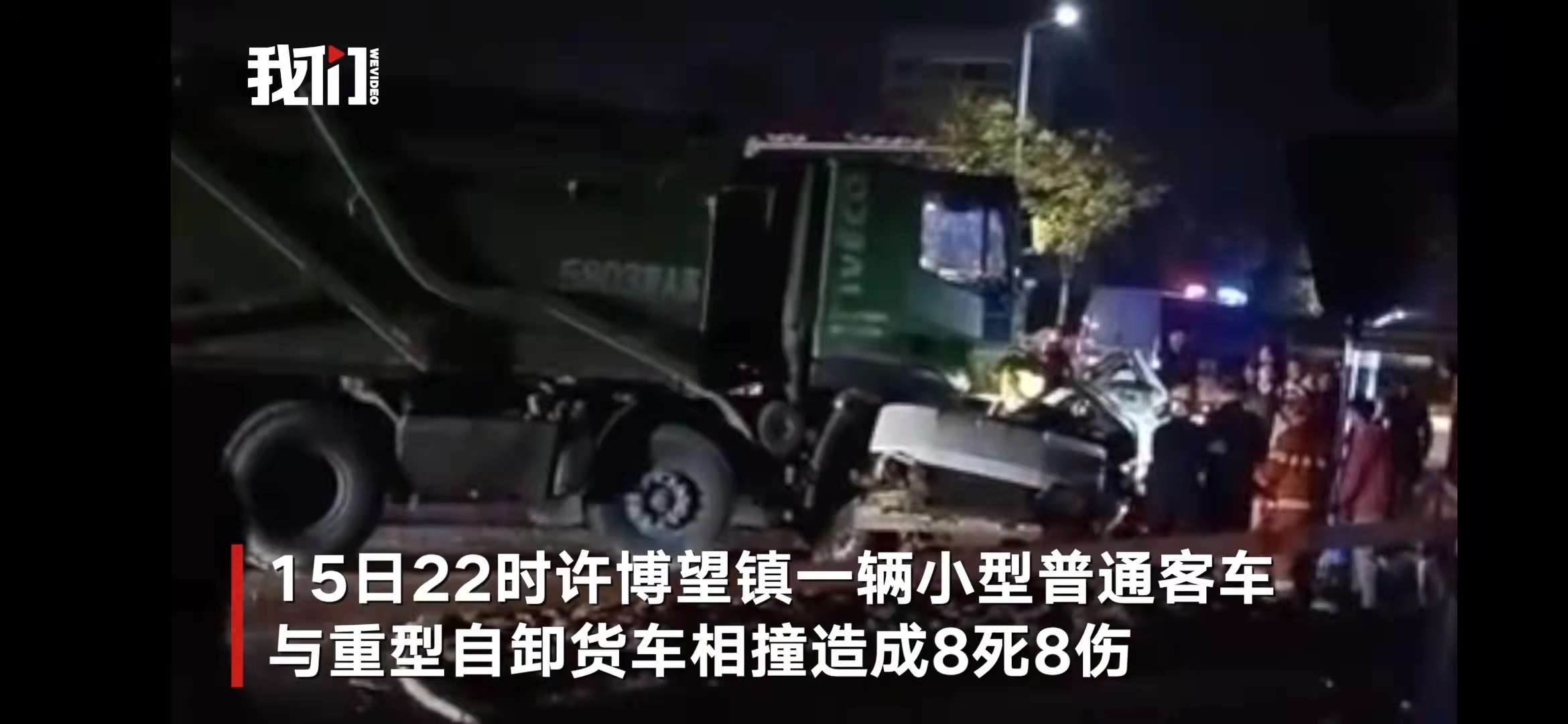 新京报讯(记者 赵敏)11月15日22时11分左右,安徽省马鞍山市博望区博望镇秦岭大道与新合西路交叉口发生小型普通客车与重型自卸货车相撞事故,造成8人死亡,8人受伤。15日晚曾到过现场的当地居民告诉记者,直行渣土车撞到左转的小客车发生事故,事发十字路口为临时红绿灯,无左转指示灯,小客车搭载人员为去南京分拣快递下班回马鞍山的零工。