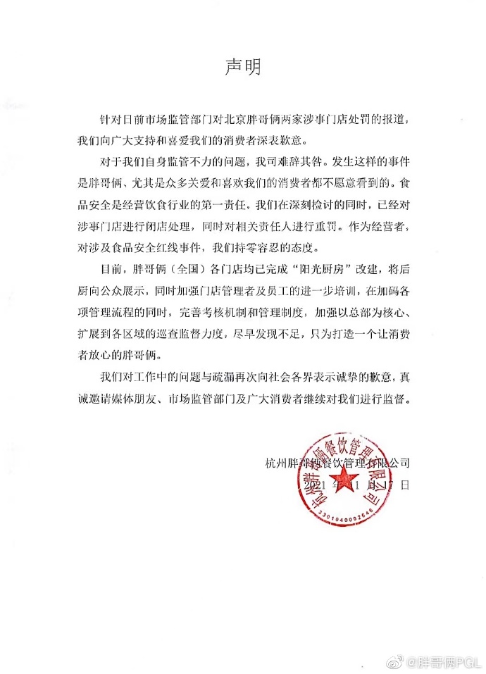 新京报快讯 17日,市场监管部门对北京胖哥俩两家涉事门店进行处罚。18日,胖哥俩通过其官方微博致歉,全文如下: