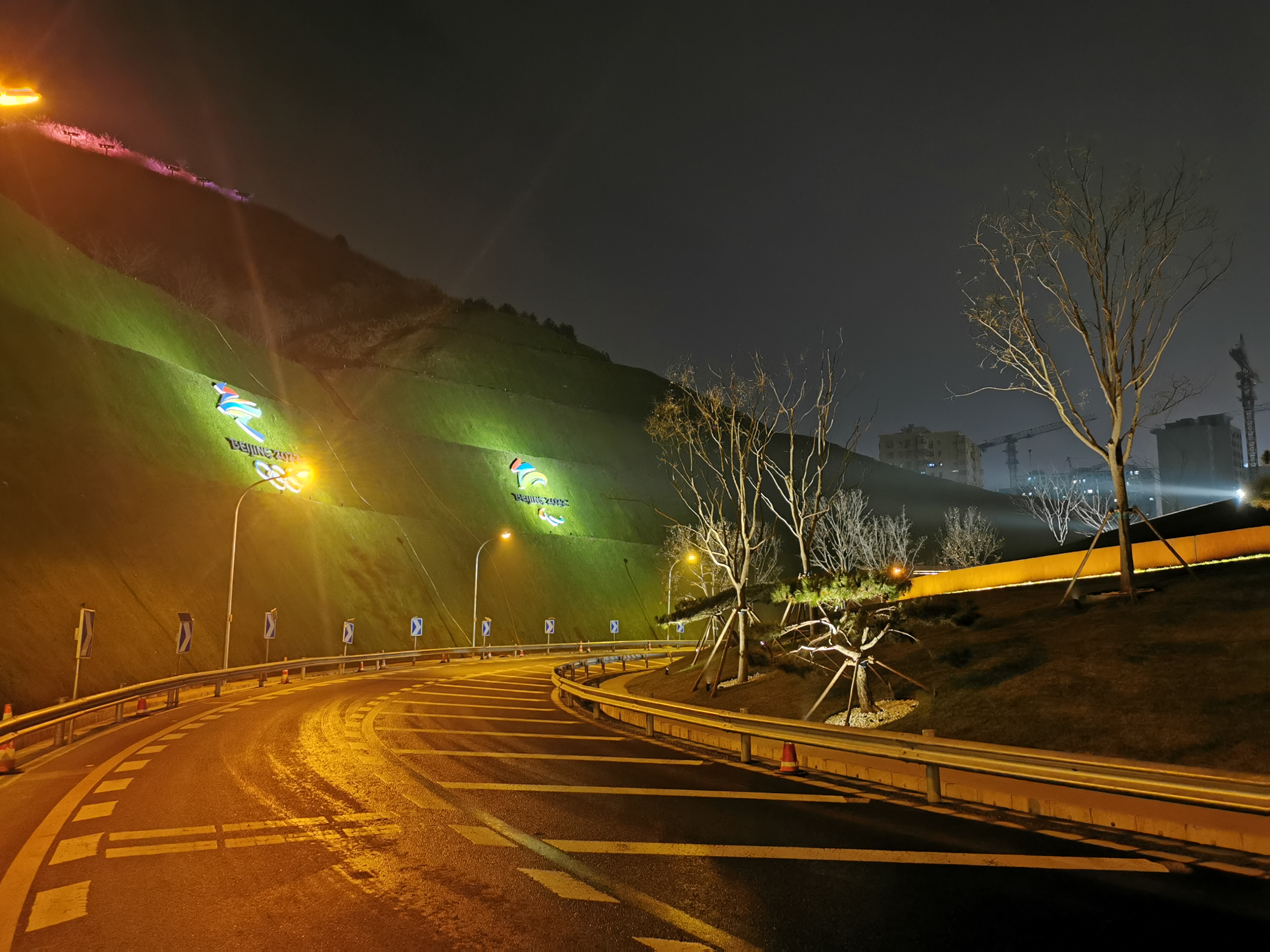 傍晚时分,石景山区五环路晋元桥道路两侧的景观照明统一开启。灯光照亮了两组20多米高的冬奥会徽雕塑,周边十万余平方米的绿地草坪植物当中散布着灯带、彩灯。以晋元桥为起点,一组组白色灯箱沿着阜石路向西延伸,形如一柄“如意”静卧在京西夜空。