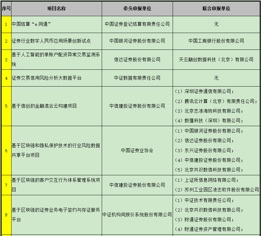 具体来看,中信建投以牵头申报单位身份出现的项目包括 “基于信创的金融混合云构建项目”以及“基于区块链的客户交互行为体系管理系统项目”。而作为联合申报单位,中信建投则参与了中国证券业协会牵头申报的“基于区块链和隐私保护技术的行业风险数据共享平台项目”。