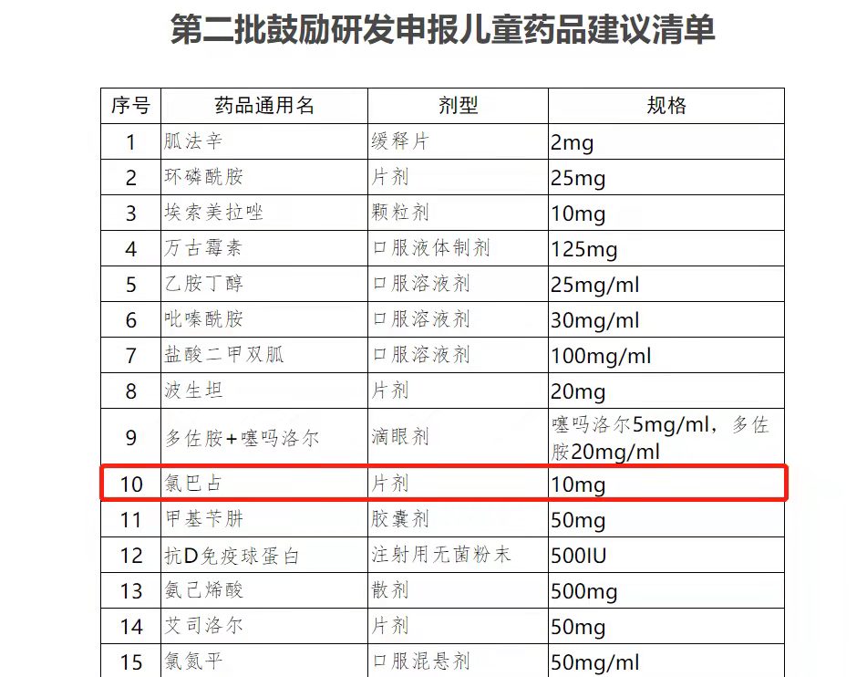 ▲2017年5月12日,国家卫生健康委员会发布《关于第二批鼓励研发申报儿童药品建议清单的公示》,清单中第10项为规格10mg的“氯巴占 ”。图/国家卫生健康委员会官网截图