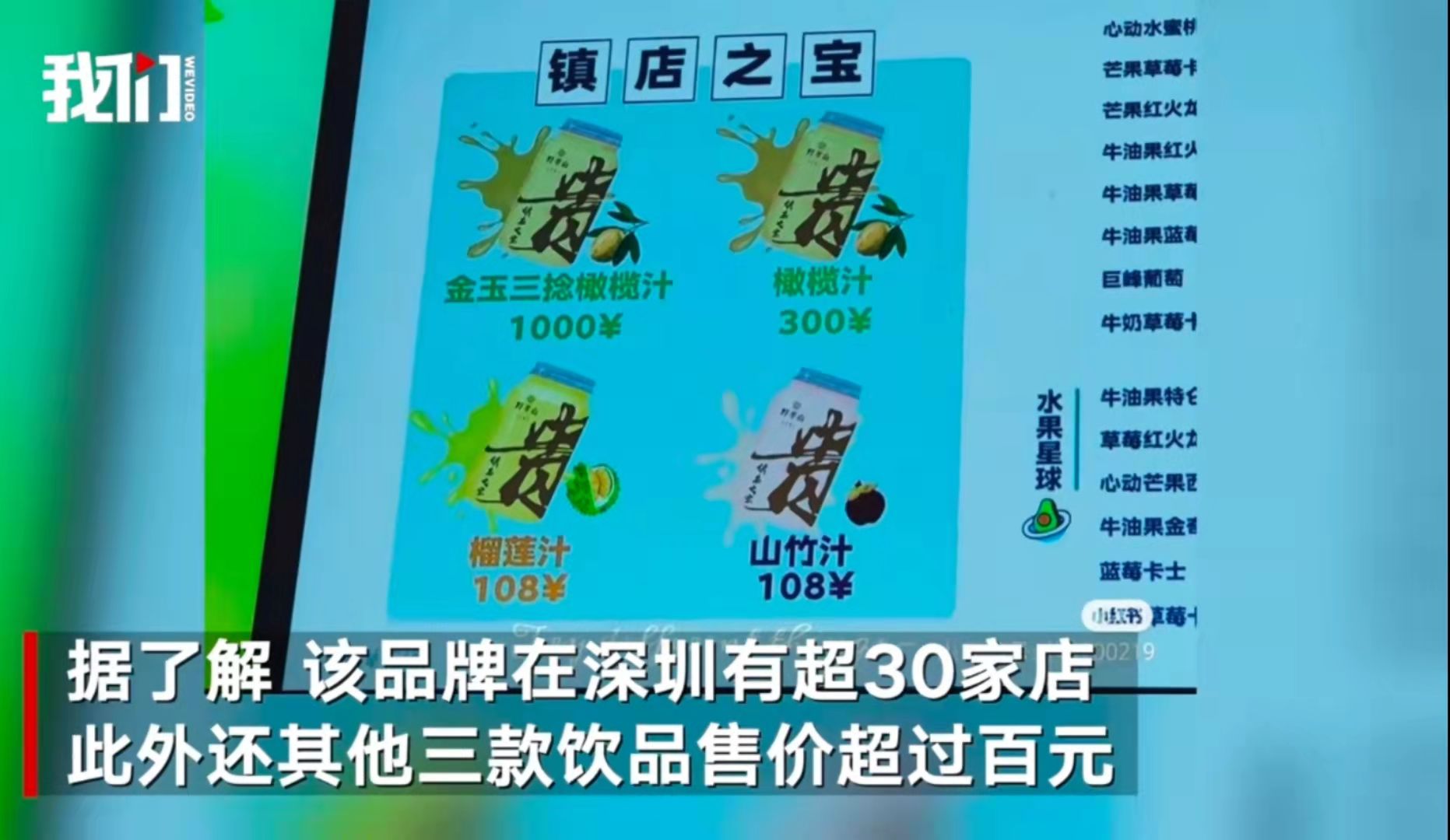 ▲深圳某饮品店一款名为“金玉三捻橄榄汁”的饮品标价1000元,另有三款饮品标价超过100元。图/新京报我们视频截图