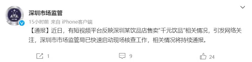 ▲11月22日,深圳市监局回应“千元饮品”相关情况,称“已启动现场核查”。图/深圳市场监管官方微博截图