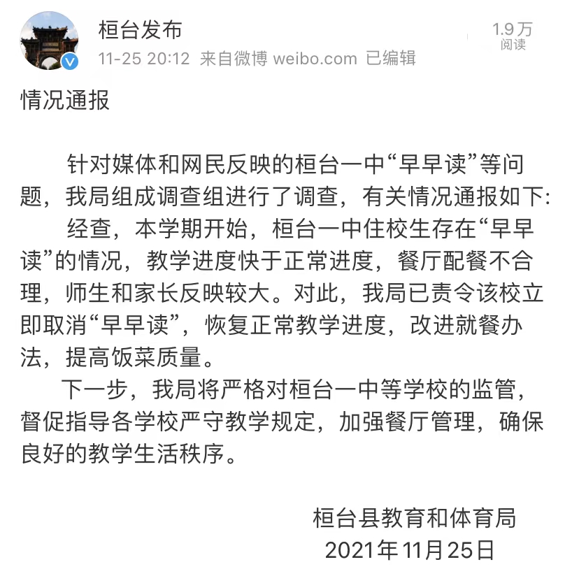 新京报快讯 据淄博市桓台县委宣传部微博消息,11月25日,桓台县教育和体育局发布情况通报。