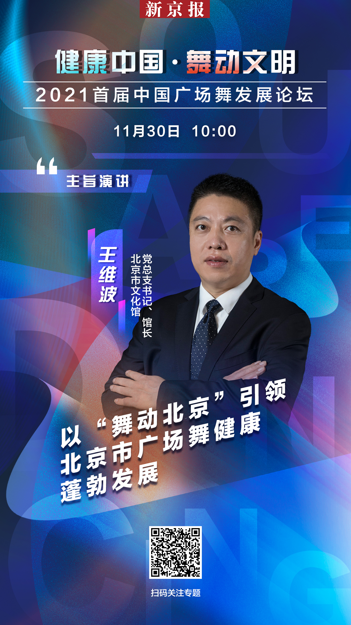 新京报讯(记者 查志远) 11月30日,由首都精神文明建设委员会办公室、北京市文化和旅游局指导,新京报社、千龙网、北京舞蹈学院、北京市文化馆、北京舞蹈家协会联合主办,新京智库承办的“健康中国•舞动文明——2021首届中国广场舞发展论坛”在线上举行。在论坛上,北京市文化馆党总支书记、馆长王维波就“以‘舞动北京’引领北京市广场舞健康蓬勃发展”发表主旨演讲。