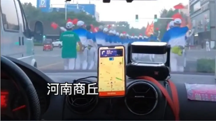 ▲河南商丘有健走团机动车道上锻炼,汽车只能尾随其后。图/视频截图