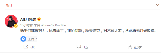新京报讯(记者 赵雪)2021KPL(王者荣耀职业联赛)秋季赛季后赛于昨晚拉开帷幕。揭幕战中,成都AG超玩会1比4不敌济南RW侠,被淘汰出局。赛后,AG主教练严明(ID:月光)主动揽责,单方面宣布将卸任主教练一职。