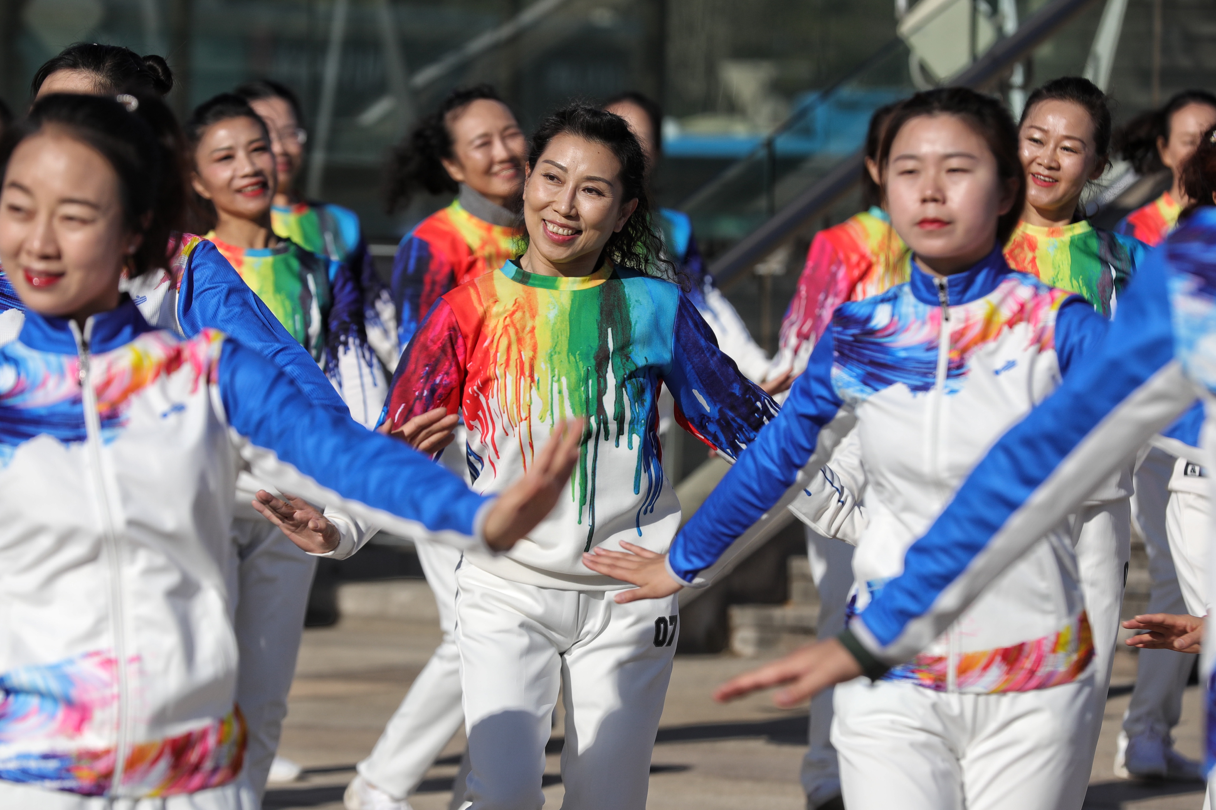 进入深冬,空旷的室外场地上有些寒冷。为了动作更加整齐、规范,140余名参与者裹着羽绒服,一遍遍认真练习舞蹈动作。