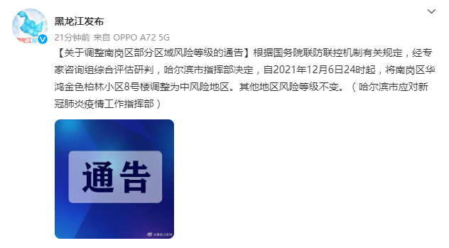 新京报快讯 哈尔滨市应对新冠肺炎疫情工作指挥部通报,根据国务院联防联控机制有关规定,经专家咨询组综合评估研判,哈尔滨市指挥部决定,自2021年12月6日24时起,将南岗区华鸿金色柏林小区8号楼调整为中风险地区。其他地区风险等级不变。