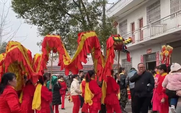 屋前早已聚满了人。他们来自附近的几个村庄,有的年岁已高,有的还抱着襁褓中的孩子,团团围住了老屋。从早上开始,村道上就有几十名穿着大红戏服的演员舞龙、舞狮,随着铿铿锵锵的乐声旋转身躯,彩带和彩球不断闪动。路上的鞭炮、礼花碎屑,延伸出500米。