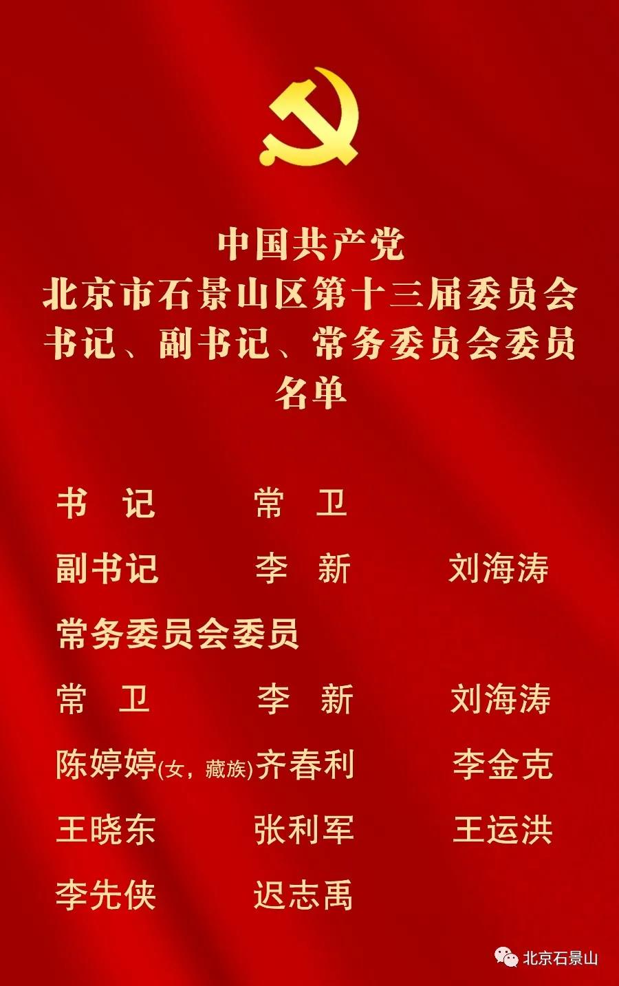 新京报快讯 据北京石景山官方微信公众号消息,12月8日下午,中国共产党北京市石景山区第十三次代表大会胜利闭幕。闭幕会后,十三届区委召开第一次全体会议,常卫当选区委书记,李新、刘海涛当选区委副书记。