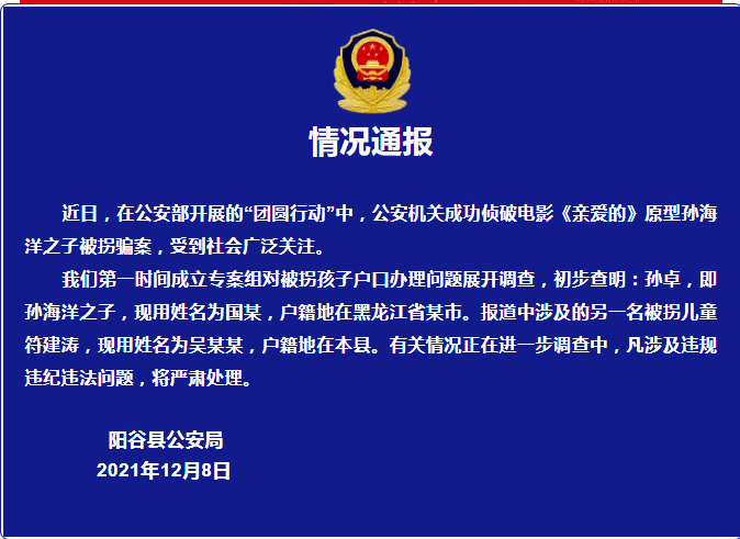 新京报快讯 据“阳谷公安”微信公众号消息,山东省聊城市阳谷县公安局12月8日发布情况通报,通报被拐儿童孙卓、符建涛户籍初查情况,全文如下: