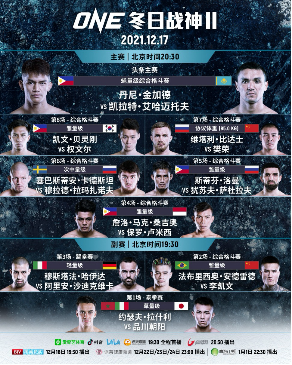 新京报讯(首席记者 孙海光)ONE冠军赛今天公布了即将于12月17日播出的“ONE:冬日战神II”战卡。压轴大戏由前蝇量级世界冠军凯拉特·艾哈迈托夫迎战世界排名第2的丹尼·金加德,两人将争夺冠军挑战权。此外,中国选手樊荣与李凯文也将在当晚出战。