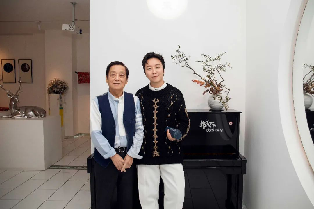 韩美林到访李玉刚“玉空间”,为其珍藏钢琴签名题字