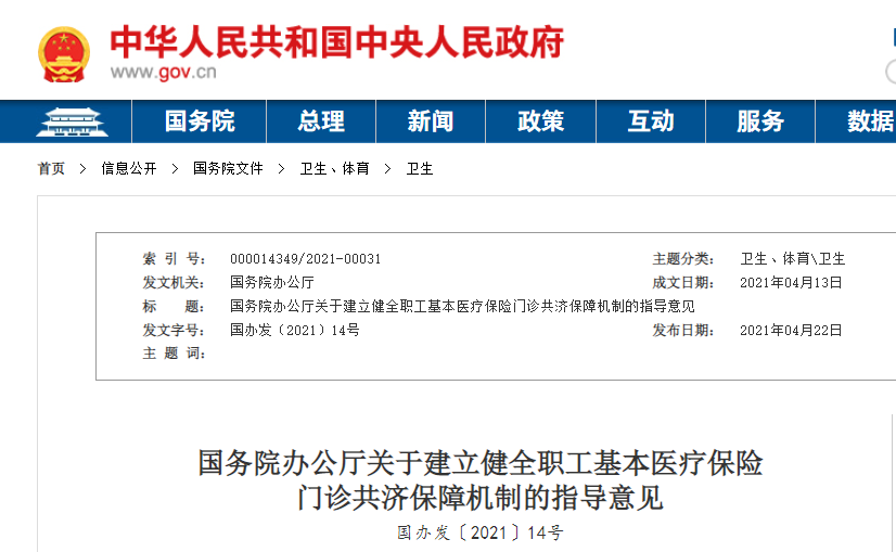 ▲4月13日,国务院办公厅下发《关于建立健全职工基本医疗保险门诊共济保障机制的指导意见》。图/国务院官网截图