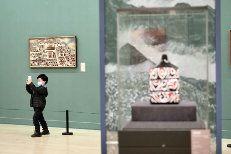 小朋友在展厅内拍摄自己喜欢的作品。中国现代漆画脱胎于漆器,诞生于20世纪20年代。漆画艺术家的探索开启了由漆器装饰向独立画种的转向,为中华古老的髹漆观念及工艺注入了新的活力。