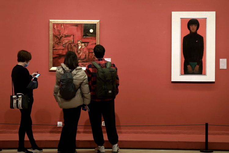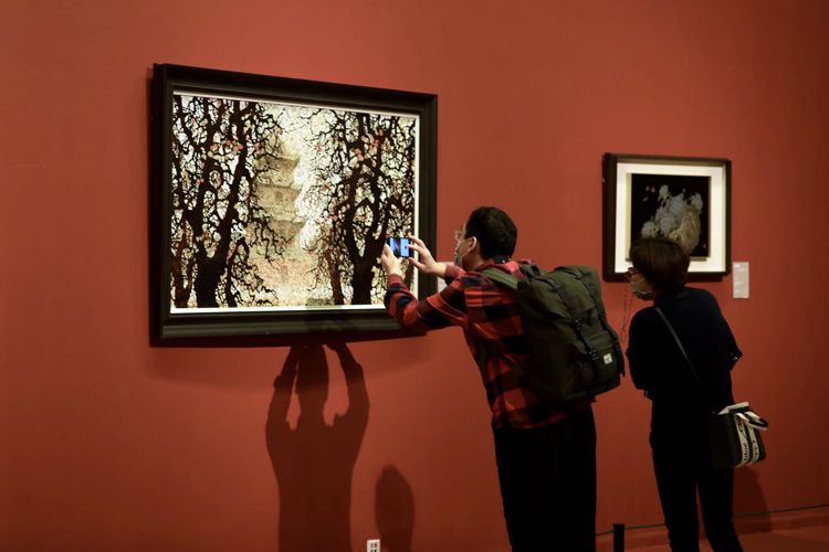 12月10日,“丹漆随梦——中国美术馆藏漆画艺术展”在中国美术馆开幕。此次展览是中国美术馆“典藏活化”系列展,分为“故园寻梦”“梦笔生花”“蝶梦鹏游”“百年梦圆”4个篇章,展出中国美术馆藏几代漆画家的精品画作200余件。图为观众欣赏陈立德1989年创作的漆画《皓月红烛》。