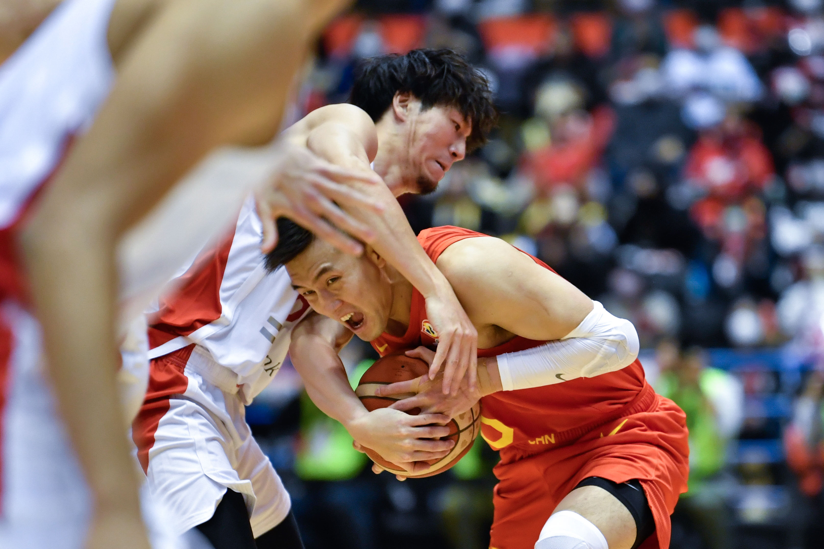 郭艾伦(右)与日本队球员比江岛慎拼抢。图/新华社