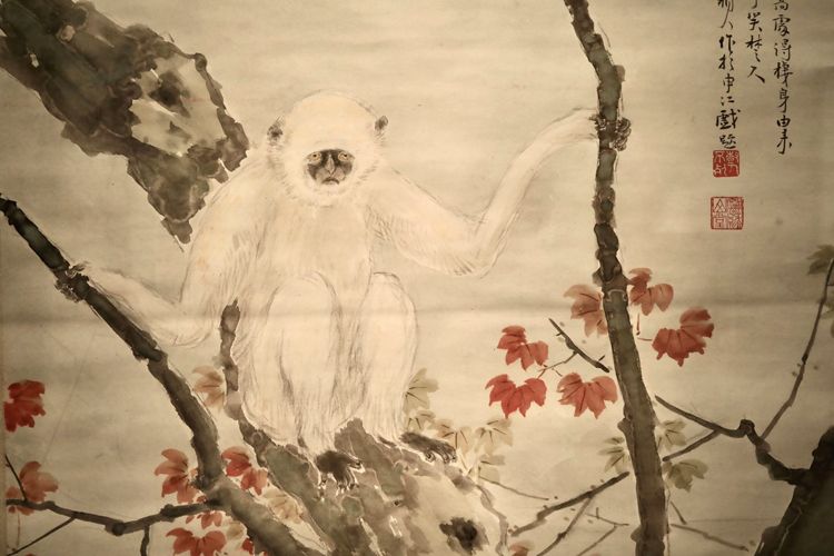 1929年作品《白猿红叶》。陈树人(1884-1948年),作为“岭南画派”的创始人之一,在20世纪中国绘画史上占有重要地位。早年师从晚清著名花鸟画家居廉,后两次赴日本留学,长达10年之久。20世纪20年代始,陈树人在政务之余,将更多精力投入到绘画创作中,徜徉于山水之间,为自然写照,抒发胸臆,创作了大量赞美自然、表现民众的绘画作品。
