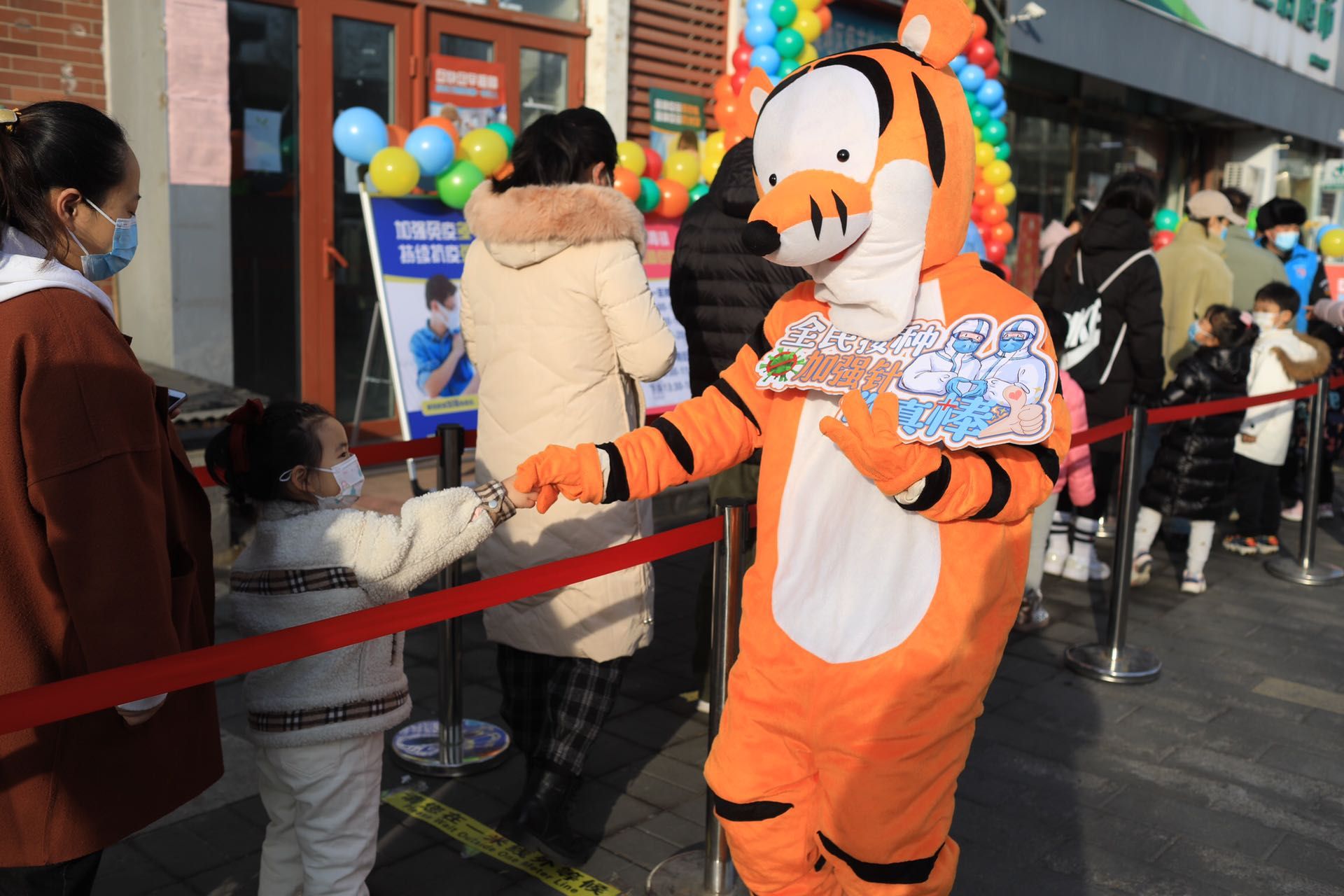 当天早上,海淀区四季青镇在疫苗接种点设置了绚丽的气球欢迎门,身着卡通服的工作人员在入口处迎接前来接种疫苗的小朋友,并与他们愉快互动。排队等候期间,幼儿园老师和接种点工作人员引导家长和孩子间隔排队,扫健康码入场。